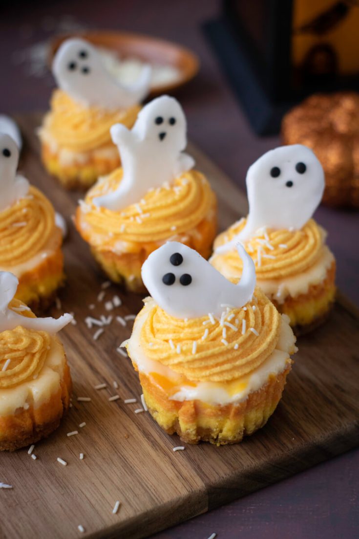 Store leftover cheesecakes in an airtight container in the refrigerator for up to 3 days. For longer storage, freeze without frosting and ghosts. Wrap tightly in plastic wrap and foil. Thaw in the fridge before decorating.