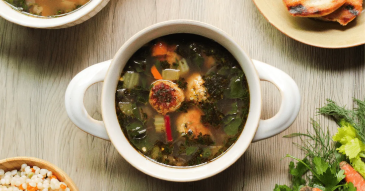 This flavorful soup is filled with mini pasta, tiny ground sausage meatballs, herbs, spices and lots of vegetables (carrots, celery, leafy greens and more). Think of it as an elevated chicken noodle soup.